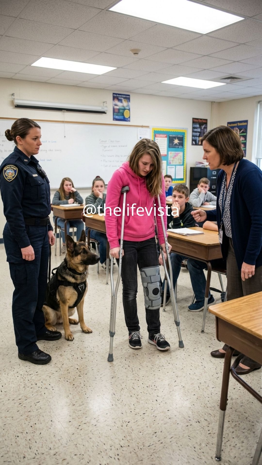 “Ma’am, you can’t just enter during instructional time,” Ms. Calder said. Principal Elaine Thornton appeared moments later, summoned by the office staff who had seen the uniform and the dog on security cameras. Her heels clicked briskly against the tile, and her face held that practiced calm administrators wear when they want to look in control even as their eyes scan for risks.