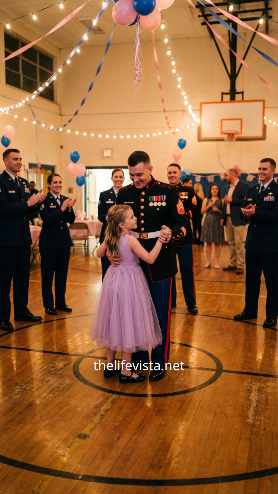 He led her to the center of the floor with careful, deliberate movements, as though he understood exactly how much this moment carried and had decided, without hesitation, to shoulder part of that weight for her. She stepped onto the tops of his shoes, just the way the other girls had done with their fathers, her little hands resting lightly against his uniform. Gradually, her body began to loosen, the tension melting out of her posture as the moment settled around her.