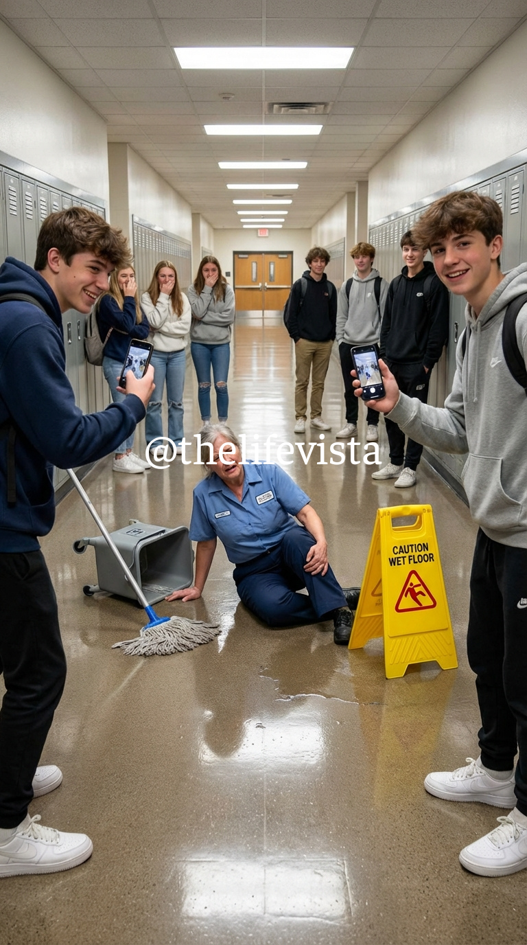 One afternoon, Mara was mopping the east hallway when she felt a sharp strike behind her knee. Her bucket tipped, water spilled across the polished floor, and she collapsed with a thud.