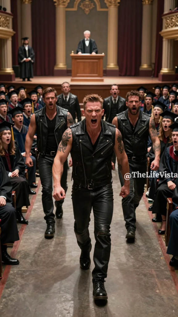 Then the heavy double doors at the back of the auditorium didn’t creak open the way doors usually do. They blew wide like something had hit them with force, and the sound that followed didn’t belong in a university ceremony at all. It was the brutal, rolling thunder of motorcycle engines, deep and high-compression, a roar that punched through the solemn music and made the floorboards vibrate under every seat. Heads snapped around. Parents gasped. The provost froze mid-breath.