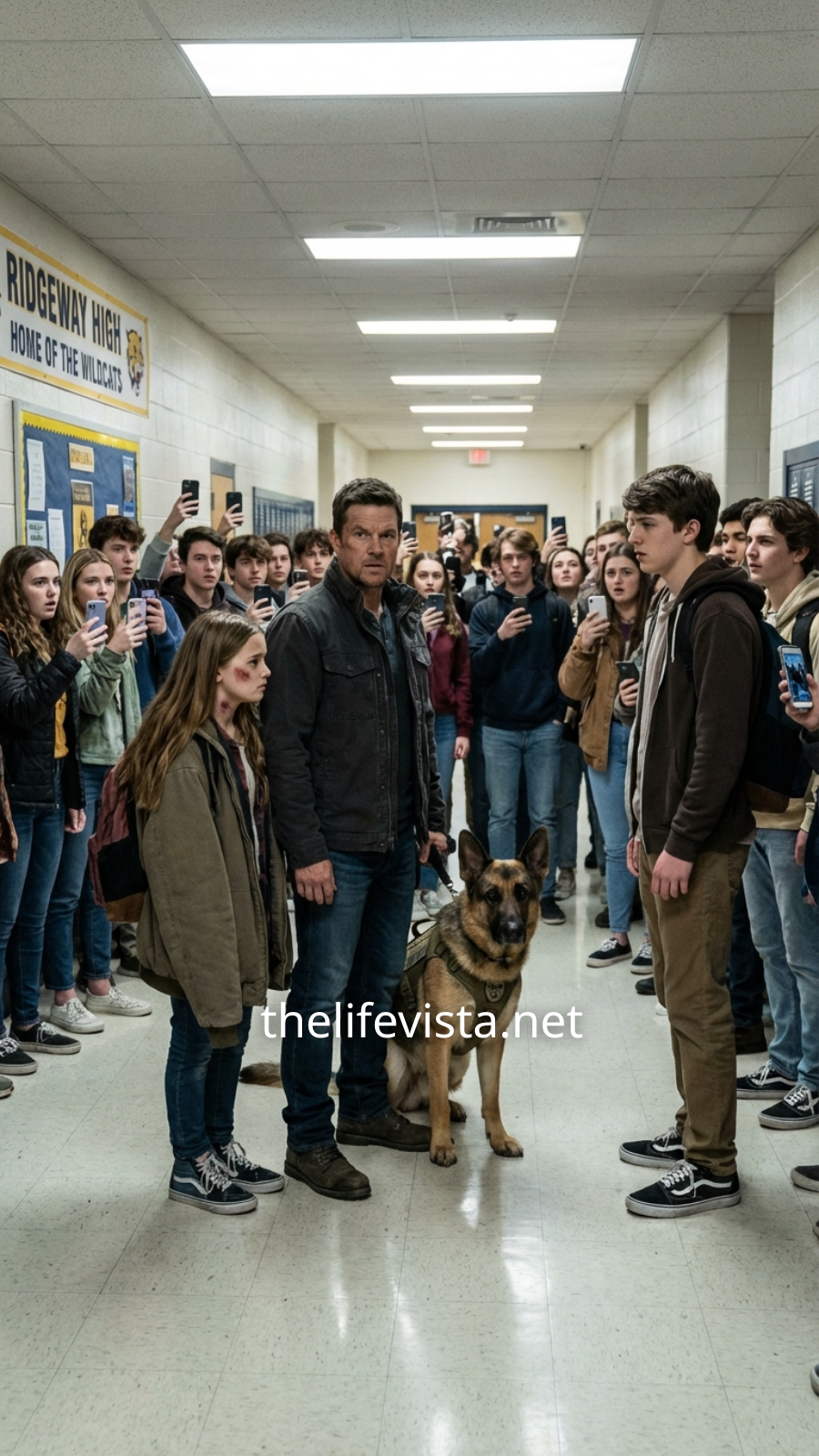 Three minutes later, Daniel pushed through the front doors of Brookstone High, his service dog K9 Titan tight at heel, and the hallway noise folded into stunned silence.