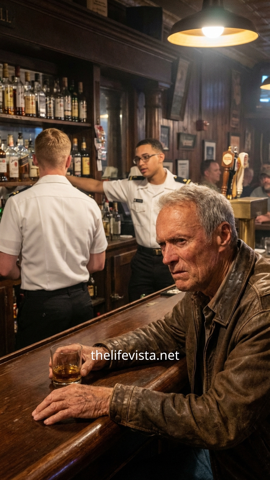 Watch the slow, deliberate turn of the Veteran’s head as his eyes meet the young officer’s, a quiet tension building in the space between them. No one in the room noticed the faded patch on his chest at first, dismissing it as just another worn detail on an old jacket—until he spoke two simple words that instantly silenced the entire bar. Listen closely to the gravel in his voice; that rough, steady tone isn’t just telling a story, it’s revealing something far deeper—a confession that’s been sitting in plain sight the whole time, waiting for someone to finally understand it.