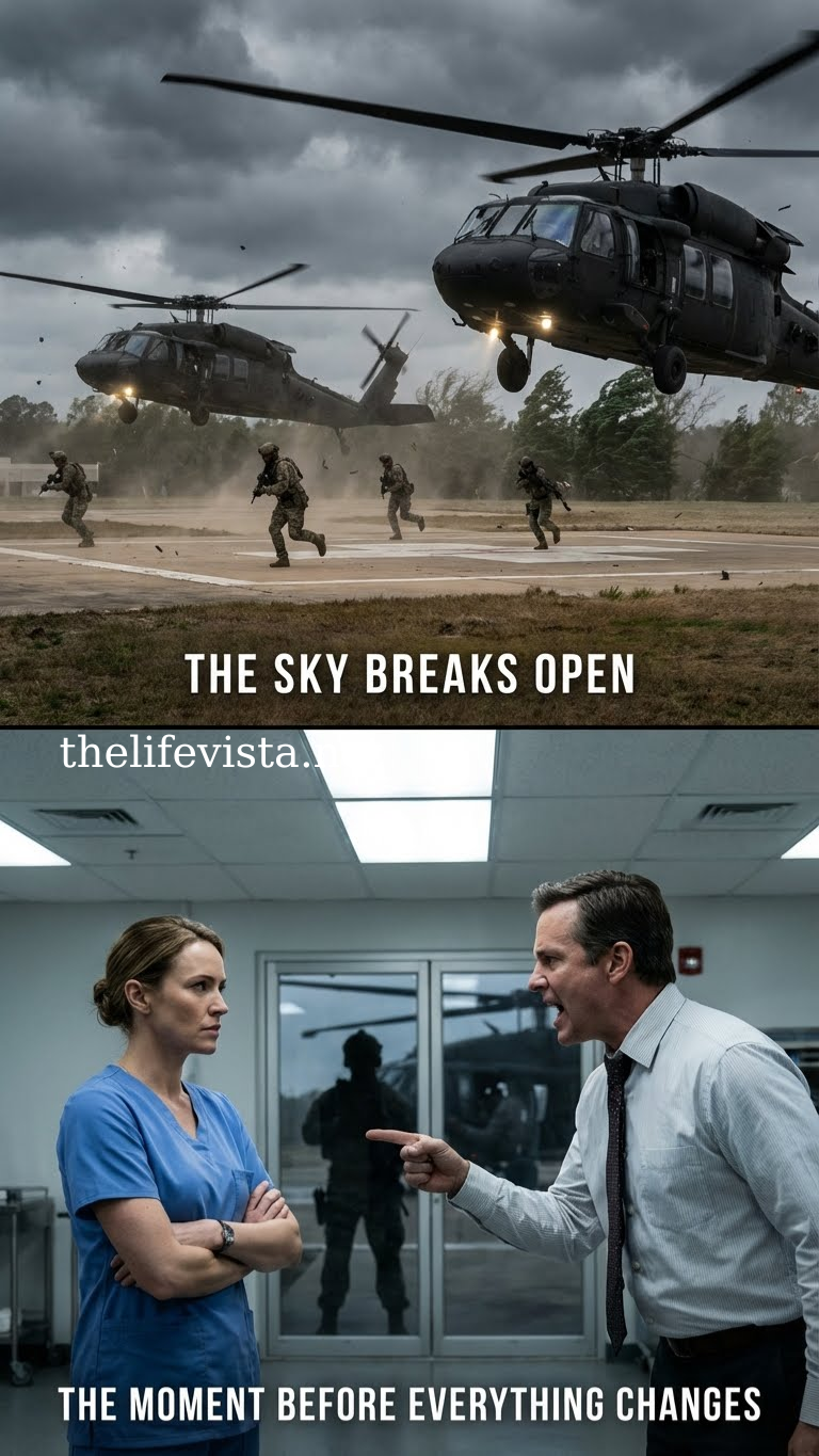 Outside, the morning sky split apart as two matte-black MH-60 Ghost Hawks descended on the hospital’s helipad with aggressive precision. Not a medical emergency. Not a media helicopter.