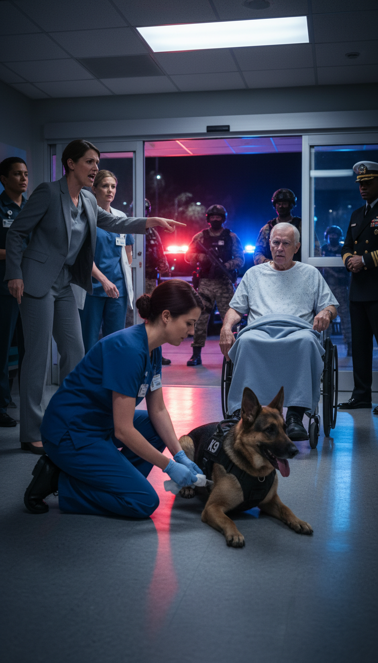 Outside Room Three, the waiting room buzzed with whispers. Someone posted a short clip online: a nurse shielding a bleeding K9 while an administrator fired her. Another clip showed Navy officers arriving and demanding care. The story was spreading faster than Rowland could contain.