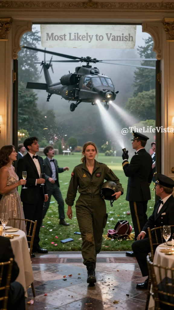 My boots hit the grass with a weight that felt like ownership, and dust drifted through the landing lights, turning their garden into a hazy stage they hadn’t intended to build. Beyond the glare, tuxedos and gowns stood frozen, faces tilted up as if they expected the aircraft to keep roaring forever, as if sound alone could explain what they were seeing. Near the French doors, clustered like a defensive line, were the four architects of the joke: Colton Hargrove, Bianca St. Clair, Graham Weller, and Trey Maddox. Colton’s mouth hung open like his brain had failed to load the correct expression, Bianca clutched her phone as if she could record her way back into control, and Graham’s hands looked undecided about whether to hide in his pockets or beg for forgiveness. I adjusted my flight jacket, tucked the helmet under my arm, and started walking without smiling and without waving, because I wasn’t there to perform gratitude for their attention. The crowd parted, not politely, but instinctively, like people stepping back from heat or holiness, and every crunch of my boots on their immaculate path sounded louder than it should have. When I stopped in front of Colton, close enough to smell expensive scotch layered over fear, I watched recognition try to wrestle with denial in his eyes, the old memory of the girl he’d tormented refusing to match the woman who had climbed out of an att@ck helicopter like it was just transportation. “You sent me an invitation,” I said calmly. Colton blinked, throat bobbing. “I… we… we thought—” “I know what you thought,” I cut in, holding his gaze until he flinched. “I’m here.” I brushed past him, the rough Nomex of my sleeve against his silk lapel, and walked straight into the ballroom, leaving the door open behind me like a wound refusing to close.