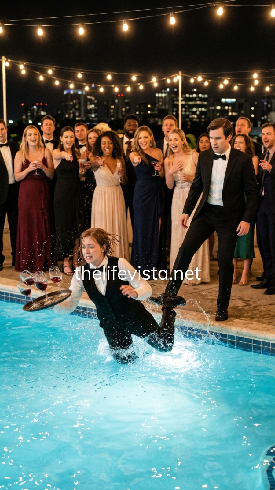 The impact with the rooftop pool was sharp and freezing. Water swallowed her whole, the tray flying from her hands as glass shattered against the tiles. Champagne frothed across the surface as shards scattered.