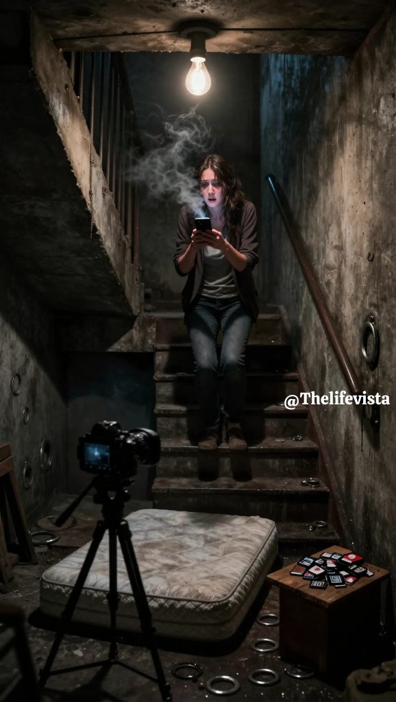 It swayed back and forth throwing crazy shadows on the gray concrete walls. My phone shook in my hand, but I kept recording everything. The smell h!t me first, like old gym socks mixed with something sour that made my stomach lift. At the bottom of the stairs, I stopped and stared at what they’d set up down here.