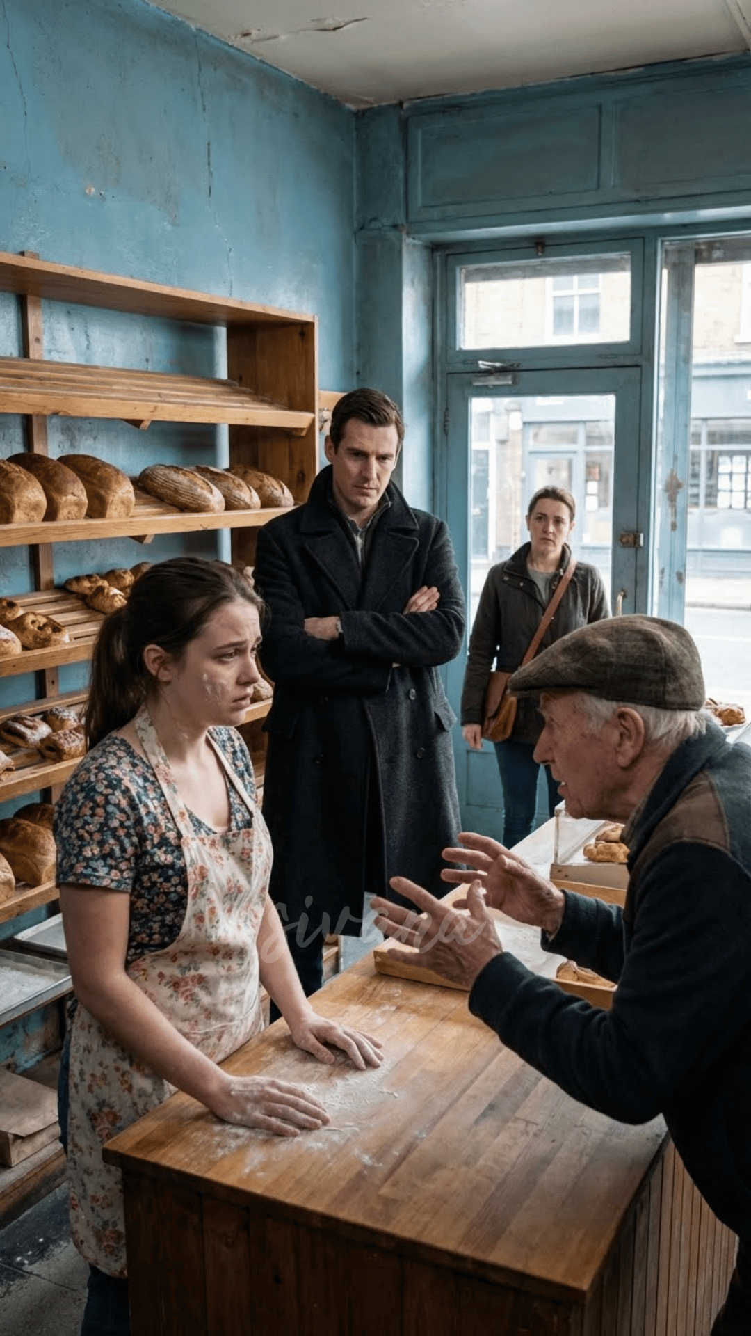 Inside, Mia was wiping down tables, her hair tied up, hands still dusted with flour.