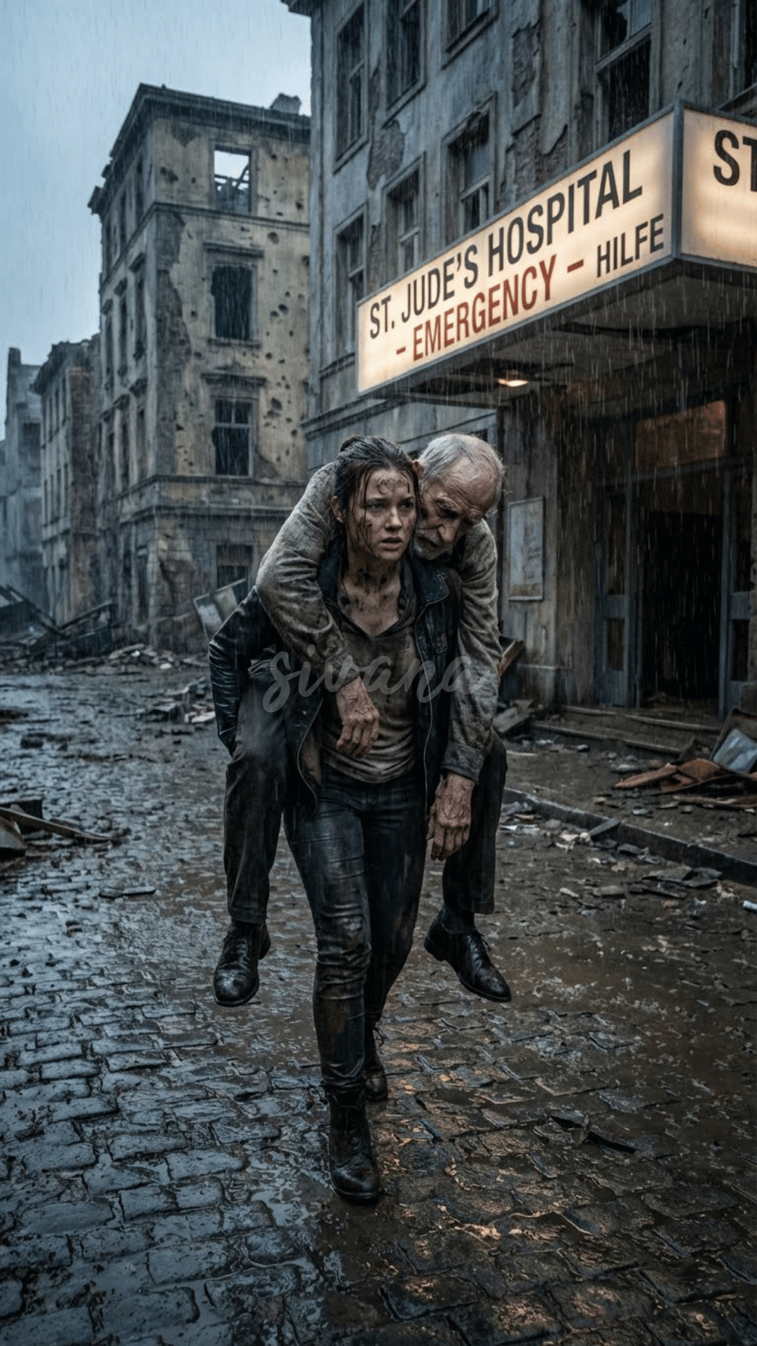 stood an old man in a soaked sweater, gripping a streetlamp like it was the last thing keeping him upright.