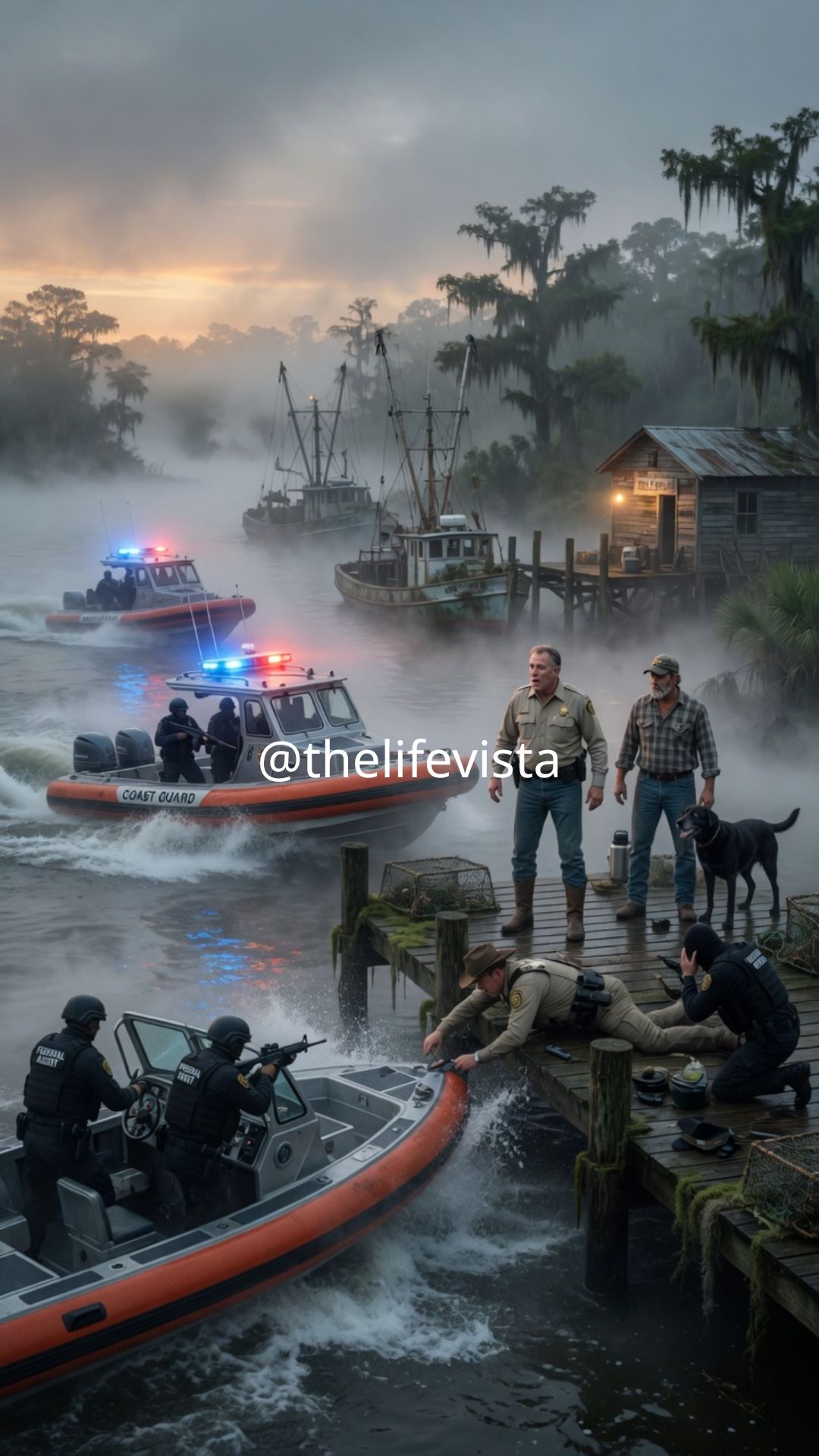 The final morning unfolded before sunrise with the kind of thick Louisiana fog that blankets the basin and makes the river itself seem to be hiding its own long list of sins from prying eyes. Frank Dalton called me at 4:40 a.m. to confirm that federal teams had already moved into position farther down the basin, with Coast Guard fast boats waiting silently without running lights and a joint task force from Homeland Security Investigations and state police fully integrated into the operation because the smuggling route had now been linked to fuel theft, contraband transport, and widespread public corruption at multiple levels. My only assigned role was to remain in place, continue recording everything that happened on my property, and avoid giving any warning to the men who would soon arrive. At 8:15 that morning Sheriff Raymond Cole pulled up in an unmarked SUV along with two deputies, the same attorney who had previously tried to buy my land, and three additional men I recognized from the nighttime transfers I had captured on camera. They walked up my dock with the confident stride of people who believed they already owned every board beneath their feet, and Sheriff Raymond Cole carried a fresh folder while wearing a smile that looked carefully rehearsed for the occasion.