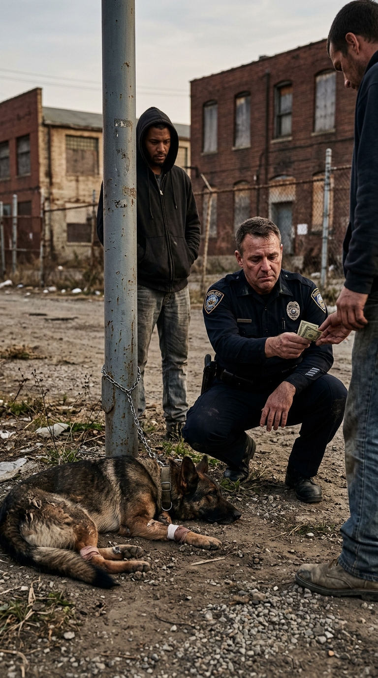 Near the back row, between cracked mirrors and old fishing reels, a man sat on a folding chair beside a wire crate. A cardboard sign leaned against it in thick marker: “RETIRED POLICE DOG. $10. NO RETURNS.” Inside the crate was a German Shepherd—skinny, dull-coated, breathing shallowly. One ear had a healed split. The dog’s flank showed scars that weren’t from normal street work. They looked like the kind of marks you got when someone wanted you to remember pain.