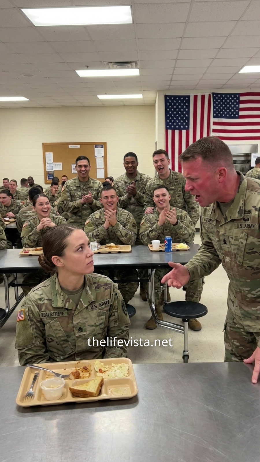 The entire mess hall saw a tired woman’s gaze meet a young sergeant’s glare.