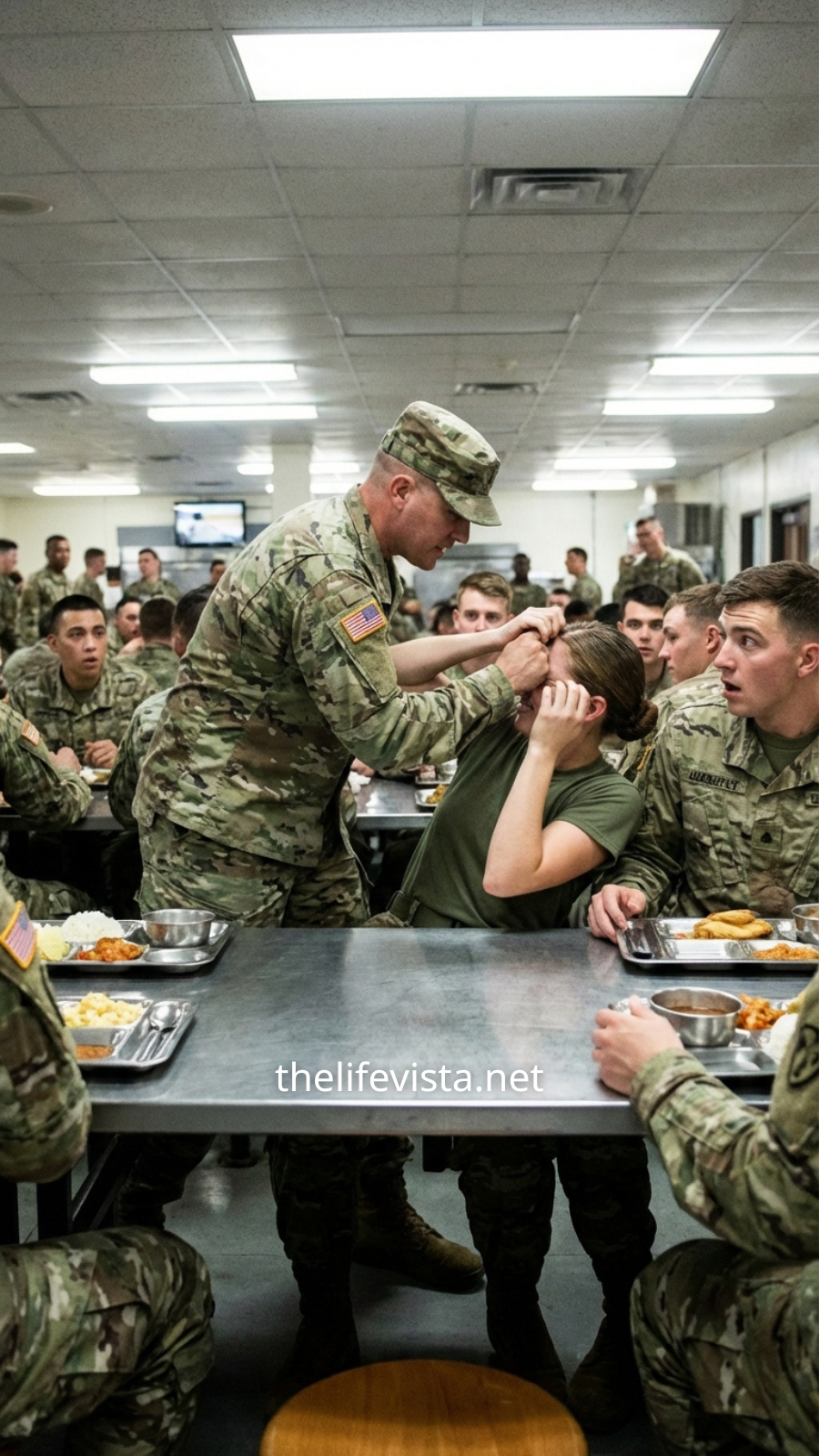 The lunch line at Fort Redstone moved with that slow, worn rhythm that comes after a long morning of drills. Boots dragged across the polished floor. Trays clanged against metal rails. The smell of overcooked green beans mixed with roast chicken and stale coffee hung thick in the air.