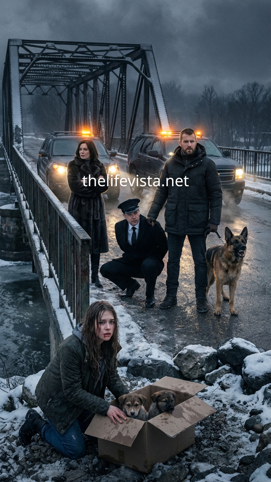 The Blackwater River rolled beneath the old iron bridge like spilled ink, swollen from winter runoff and edged with brittle sheets of ice. Two SUVs sat crooked across the narrow lane, their hazard lights blinking in slow rhythm like a warning no one intended to follow.