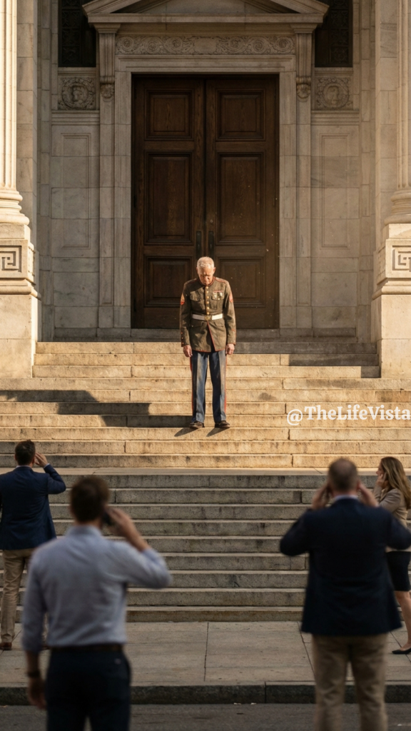 At the arched doorway, almost swallowed by shadow, stood Raymond Hollis. He was a man out of time, a ghost from an era the people inside only spoke of in gilded speeches and polished sound bites. He was a retired Marine, and his eyes, weathered and quiet, held the kind of stillness that comes only after witnessing the world’s deafening chaos. His Dress Blues, the uniform he had earned the right to wear for the rest of his life, were meticulously clean, but the fabric was thin and the deep blue faded by decades of sun and careful storage. It hugged his frame not with the crisp authority of a new recruit, but with the soft, worn familiarity of an old skin that had survived too much.