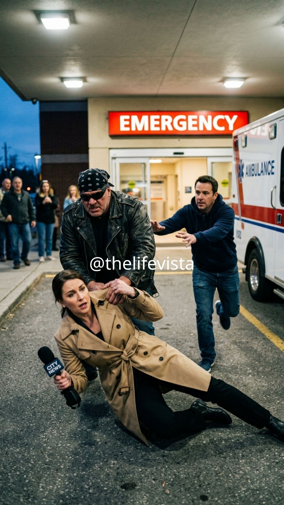 Leather-Clad Biker Knocks Reporter During Live Broadcast — the phrase exploded across Ohio before most people had even finished their morning coffee. By lunchtime, it was trending nationwide. By evening, thousands had already judged him guilty, replaying the same twelve seconds as if repetition could substitute for understanding. The video was short, chaotic, and perfectly cut for outrage. A muscular biker in a sleeveless leather vest lunged forward and shoved a young female reporter to the pavement during a live broadcast outside St. Matthew’s Medical Center in Cleveland. Her phone spun out of her hand. The livestream tilted to the sky. Gasps. A shout: “Call the police!” It looked brutal. It looked deliberate. It looked like a man attacking the press in broad daylight, and in an era built on immediacy, looking guilty was often indistinguishable from being guilty.