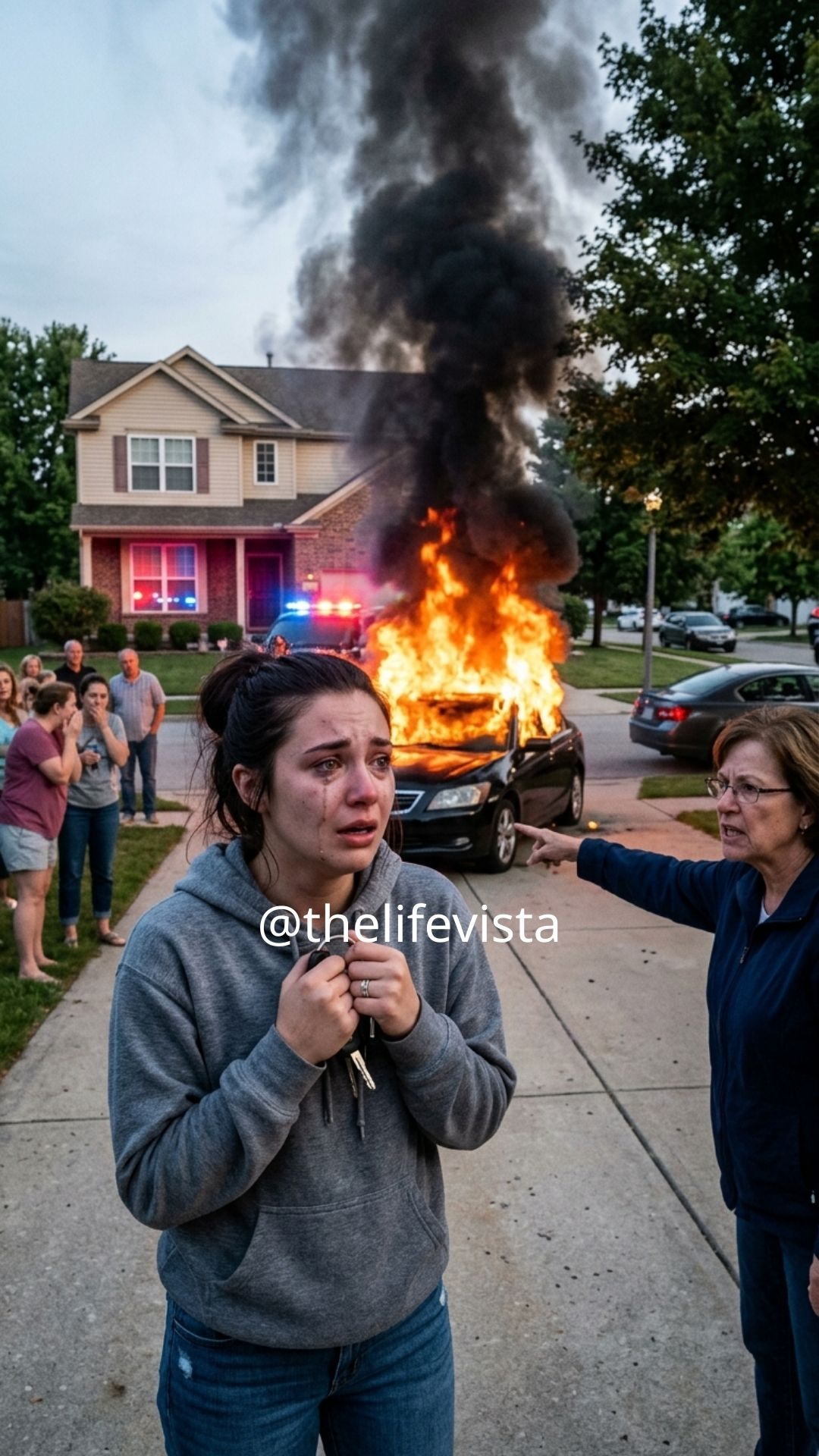 When I refused to hand my car over to my stepsister, my stepmother set it on fire. She laughed and told me, “If you won’t give this car to my daughter, then it won’t belong to you either.” I didn’t say a word. I quietly packed my things and left, knowing that chaos was about to erupt in the house—especially because that car was actually…
