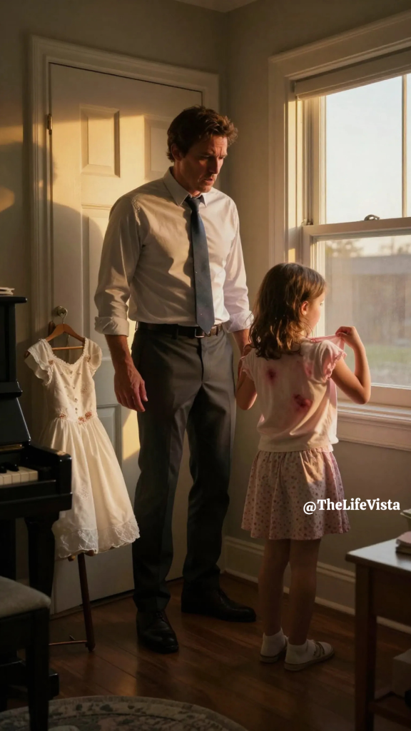 When I reached the bedroom door, I knocked lightly and said her name before opening it. The room was filled with the soft orange light of the late afternoon sun. Her velvet recital dress hung neatly over the back of a chair, untouched and perfectly arranged. My daughter, Emma, stood by the window wearing jeans and an old T-shirt with a cartoon animal on it. She held her phone tightly in both hands as if she needed it to steady herself.