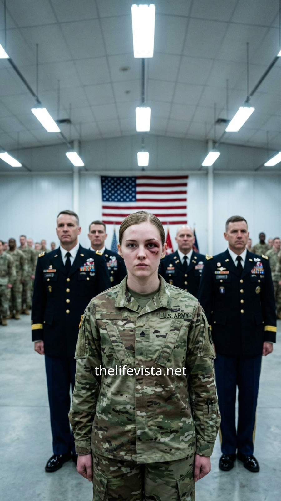 In a silent corridor lined with the highest-ranking officers on the base, the bruised young soldier stood firm and unshaken—on the brink of revealing a truth powerful enough to rattle the entire command structure to its core.