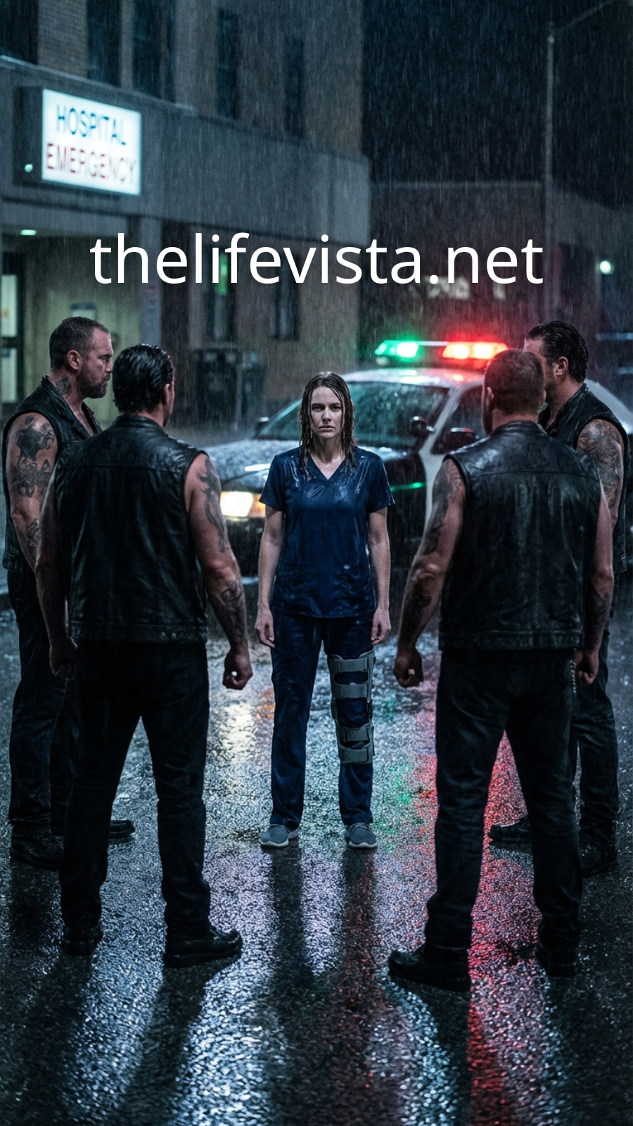 Rain pooled under neon lights as Lena moved through quieter corridors, her brace rigid beneath her scrubs, each step echoing with old memories. The bikers were detained temporarily, but she knew they were only the surface of something deeper.