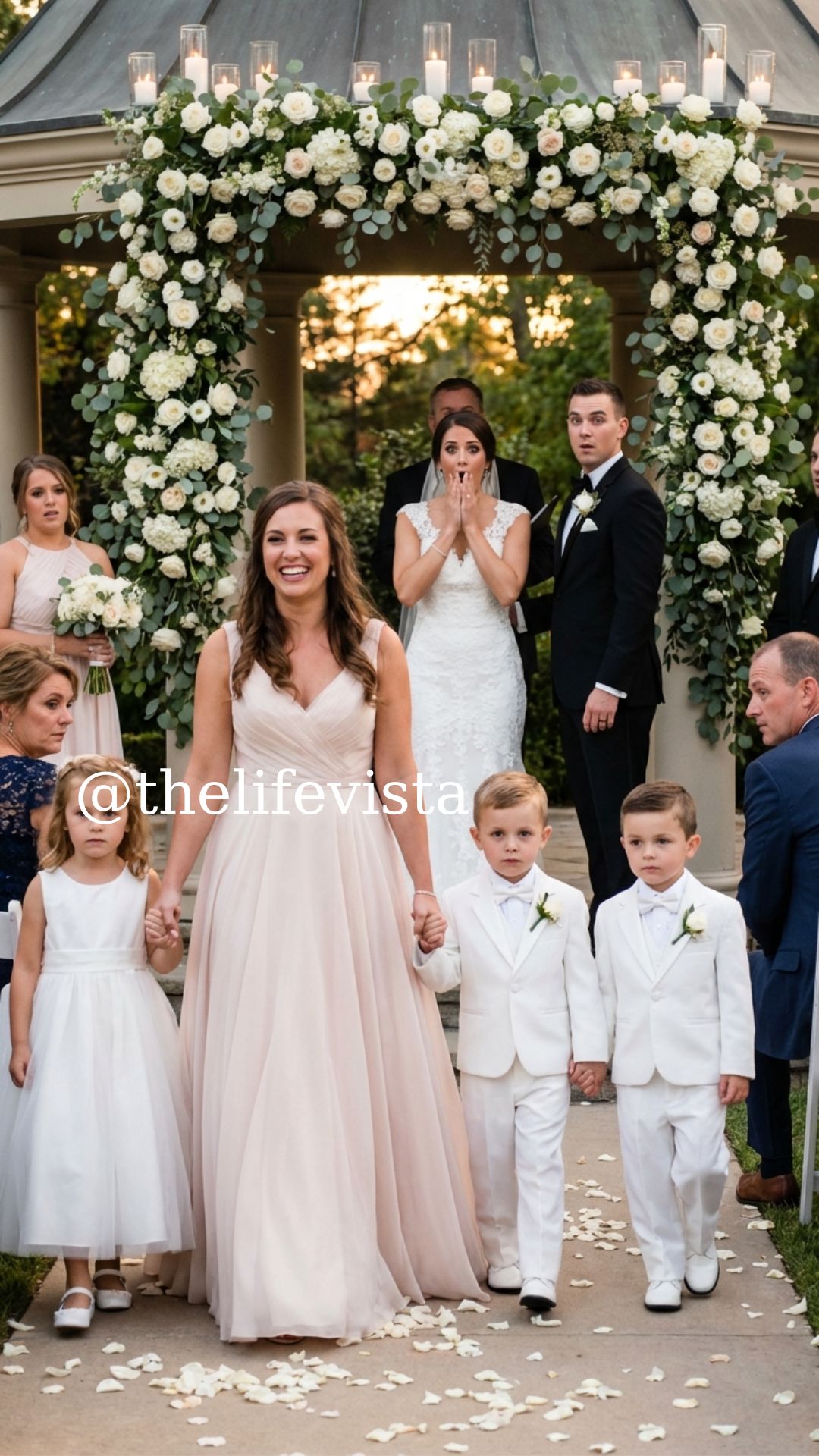 Behind her, four children peeked around the corner, their eyes curious, cautious, unmistakably his.