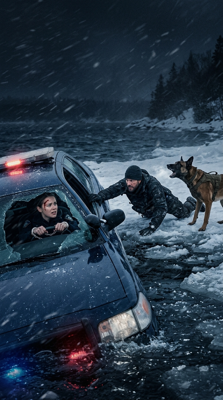 The tires slid first, then lost the road entirely. The cruiser tipped down the embankment, crashing through brush and brittle shoreline ice before slamming nose-first into the black, freezing water below. The windshield fractured in a spiderweb burst. Lake water punched through the seams almost instantly, flooding the floorboards, stealing heat, stealing breath.