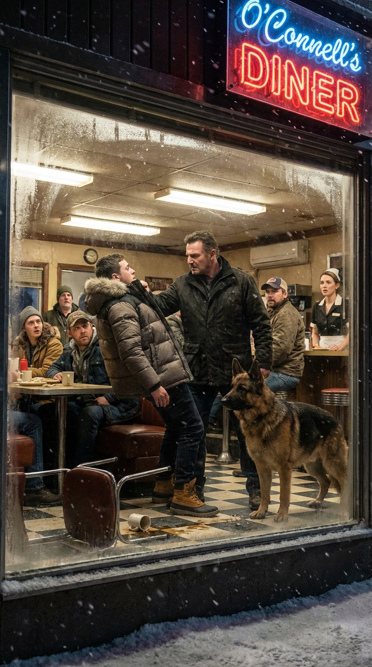 The snow came down so hard that night in Pine Ridge, Colorado, the neon sign outside Summit Grill looked blurred, like it was glowing through fog underwater. Inside, the diner was warm, crowded, and tired in the familiar way small-town places get during a storm. Truckers nursed coffee. A waitress refilled mugs without asking. At the counter, Ethan Ward, a former Navy SEAL with a face worn thin by long deployments and quiet habits, sat with one hand around a cup of black coffee. At his boots lay a large German Shepherd named Atlas, still as stone, eyes half-closed but never truly asleep.