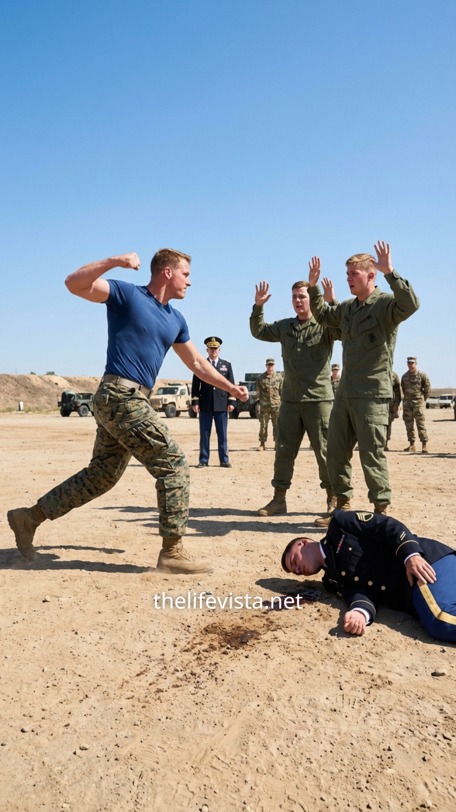 The sound echoed sharply across the training yard. Ethan’s lip split instantly. A thin line of blood appeared at the corner of his mouth.