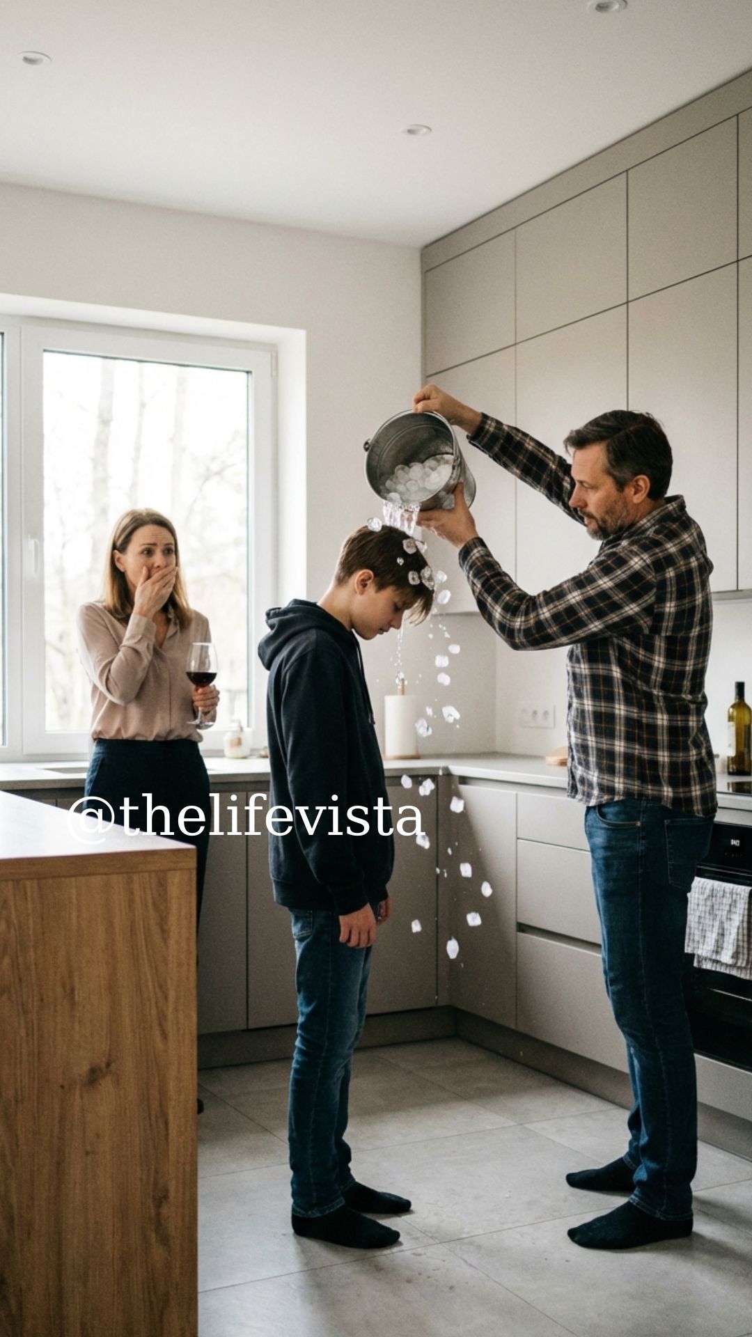 I looked around the corner of the kitchen. My daughter, Emily, was standing in the middle of the room, her school uniform soaked and clinging to her shivering frame. At her feet was a plastic bucket, and ice cubes were still bouncing on the marble. Lucas was standing over her, his face a mask of unearned ego.