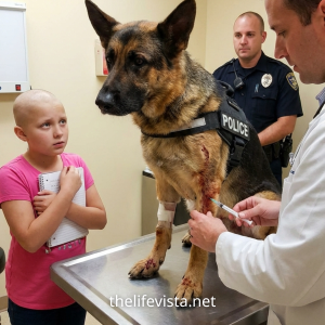 “Don’t touch him—he’s still on duty!” — A 10-Year-Old Whispered a Fallen Handler’s Secret Code and the Wounded K9 Finally Let Go The exam room at Harborview Veterinary...