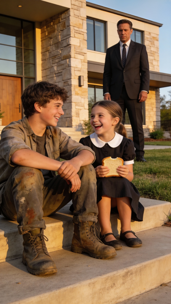 Not a reflex. Not a polite imitation. A real smile—bright, alive, unguarded. The boy said something and laughed. Eva tilted her head, curious, trusting. He opened his backpack and pulled out a crushed peanut-butter sandwich wrapped in cheap wax paper. Eva reached for it. Their fingers brushed.