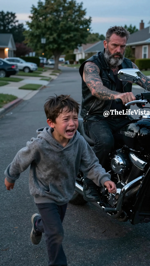 I was riding home from work on a Tuesday afternoon, engine rumbling beneath me, mind on autopilot after a twelve-hour shift at the construction site, when I heard someone screaming behind me. At first I thought it was traffic noise or kids messing around on the sidewalk, but the voice didn’t fade. It got louder. Desperate. Panicked. I glanced in my mirror and saw a small figure sprinting after my motorcycle, arms pumping, shoes slapping against the pavement, yelling at the top of his lungs.