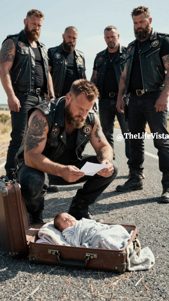 A hard-shell suitcase stood upright on the gravel shoulder like someone had placed it there with intention, a gray case with a thin pink ribbon tied neatly around the handle. Not trash. Not something that bounced out of a trunk and tumbled to a stop by accident. It sat too straight, too careful, like a message. Gravel’s chest tightened before he even touched the brakes. He lifted his fist, the signal to stop. Seven engines fell silent in sequence. Boots hit gravel. A couple of the guys stretched their backs and rolled their necks. Someone sparked a cigarette. But Gravel stepped toward the suitcase without saying a word, because something old and instinctive had already moved inside him.