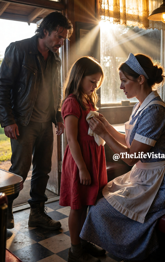 Emma had grown up in a loud, chaotic household as the youngest of five siblings, where survival depended on noticing the small details others missed, and over time she had developed an instinct for recognizing patterns, from the way someone favored an injured leg to the subtle signs of hidden illness, and Sarah’s consistent pain pattern had been bothering her for weeks. After watching the little girl suffer through too many breakfasts, Emma untied her apron, took a deep breath, and walked toward the corner booth, fully aware that approaching a six-foot-three biker president about his distressed daughter was not something most people would ever dare to do.