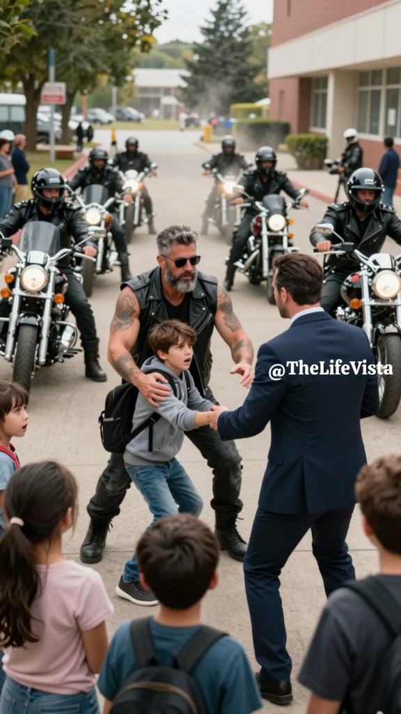 A stunned silence swept across the crowd as parents murmured and covered their mouths, and Jonathan staggered back, shaking his head and insisting they could not do this and that they were threatening a child, but the biker corrected him by saying they were protecting one.