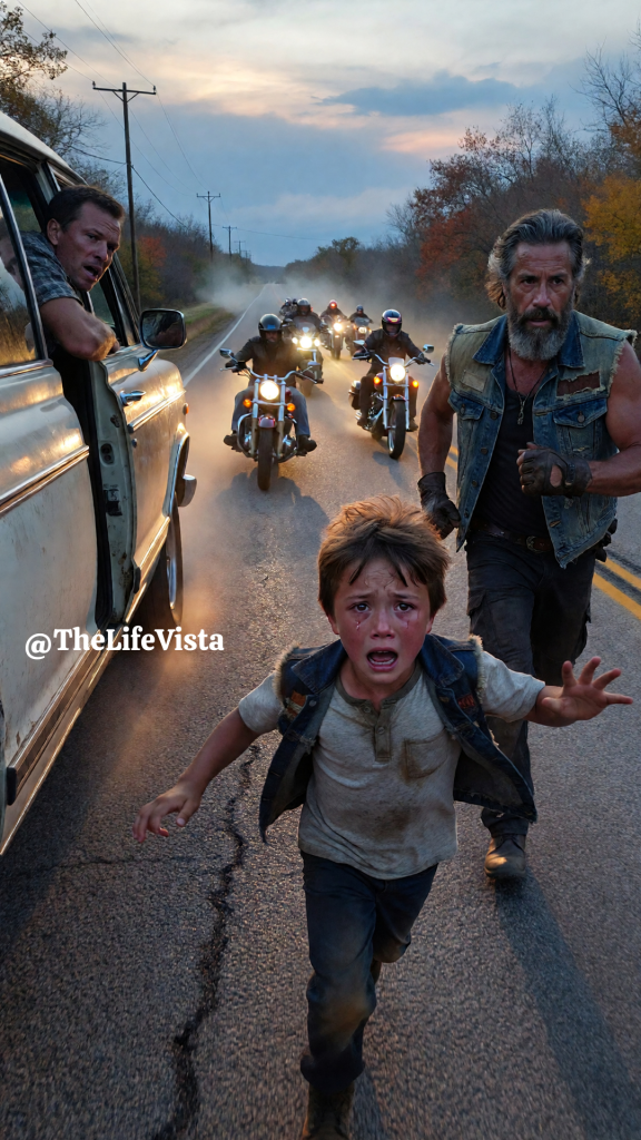 The boy burst out of the white van barefoot, tears and grit streaking down his face, his heel smeared with blood as if the road itself had bitten him, and the sound that came out of him wasn’t a simple cry, it was terror sharpened into a blade as he screamed, “Let me go,” and that scream cut through the dusk-heavy highway in a way that made grown men snap their heads around like animals hearing a warning call. The riders were spread across two lanes in a loose formation, engines rumbling low as the last light bled out behind the mountains, and they had been thinking about nothing more dangerous than the miles ahead until the van swerved hard onto the shoulder, gravel spitting into the air, and the side door flew open like a wound.