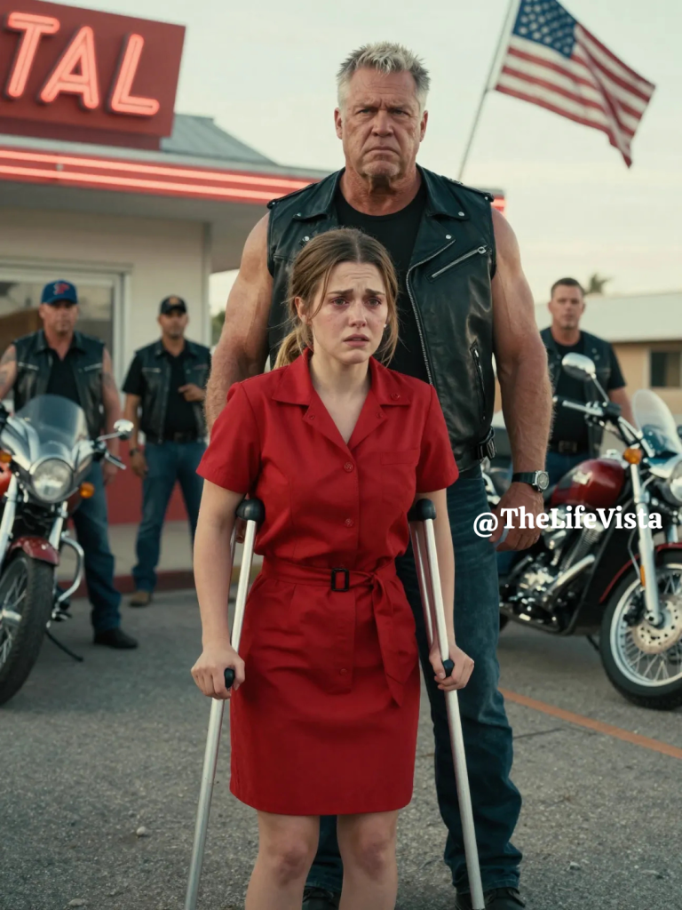 The diner was called Pearl’s Place, one of those forgotten roadside stops that time had polished instead of ruining, with red vinyl seats patched with duct tape like scars nobody bothered to hide anymore, a jukebox that seemed to think music stopped improving after 1987, and a smell of burnt coffee and maple syrup thick enough to taste. Behind the counter, a woman in her late twenties looked up and smiled automatically, a genuine smile that still had warmth in it, but there was a tiredness threaded through it that had nothing to do with the hour and everything to do with the life she carried when she thought nobody was looking. Her name tag read Hannah in faded letters, and her real name was Hannah Pryce, though she rarely said her last name out loud anymore, because last names can be anchors when you’re trying to float. She said, “Coming right up,” and she turned toward the coffee station, and that’s when Lance saw it, the smallest hitch in her left leg, not a dramatic limp, not the kind that draws immediate pity, but the kind that looked like a habit she’d trained into herself, a careful favoring of one side as if she was protecting something deep inside the joint, moving in a rhythm that said she had learned to hide pain so well it had become part of her body’s default language. Lance’s crew settled into the booths, still buzzing from the charity ride, with Drew Kincaid laughing about the kid who’d asked if their bikes were rockets, and with Mason “Mace” Calder teasing him about revving the engine too loud, and with Jett Rowan rolling his eyes like he’d heard the story twice already, but Lance’s attention drifted the way it always did when his instincts caught a thread.