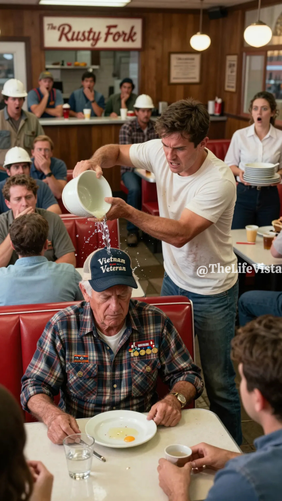 The place was called Cedar Lane Grill, a narrow, aging building squeezed between a shuttered cinema and a pawn shop that never quite managed to look clean, and it usually smelled of strong coffee, sizzling grease, and the familiar warmth of routine, but that day the air felt sharper, tense in a way that made even the clink of silverware sound nervous. At the corner booth near the window, where the morning sun always slipped in just enough to brighten the tabletops, sat Frank Mallory, seventy-eight years old, a Vietnam War veteran, a widower, and a man who had lived through things the town rarely spoke about because remembering demanded a level of respect people were no longer sure how to give. Frank ordered the same breakfast every Tuesday without fail, black coffee without sugar and dry toast with the crusts intact, and he wore his faded military cap not as a statement of pride but as a quiet reminder of the friends he had buried and the memories he carried alone.