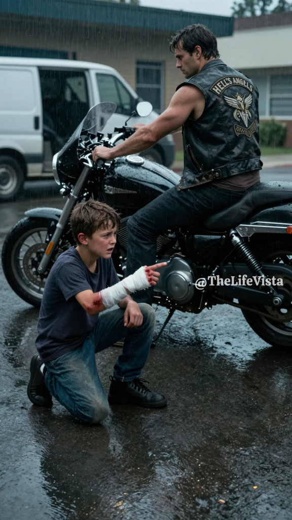 Jace stood up on legs that felt like they didn’t belong to him and walked toward the biker like he was walking toward a storm. The man turned, saw Jace’s face, saw the tears that Jace had tried to wipe away, saw the thin hoodie, the worn shoes, the posture of someone approaching a cliff. The biker didn’t move fast. He didn’t loom. He watched the way a detective watches a witness, letting the truth show itself.