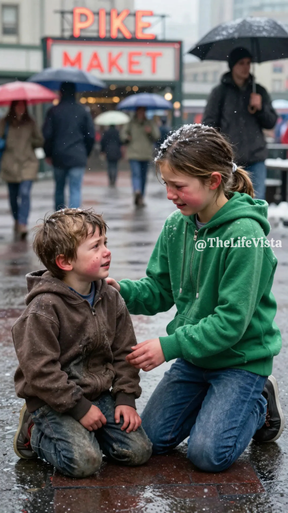 Maya didn’t have the luxury of being careless the way some kids were careless, the kind who could cry about internet speed or panic over a cracked phone as if inconvenience were the same thing as disaster. She carried a different kind of awareness, a sensitivity sharpened by survival, and life had taught her that pain didn’t always roar; sometimes it sat small and silent near a busy sidewalk and waited to be noticed. That was why she saw him before her mind had time to explain it away, a little boy tucked near the entrance to a crowded shopping district with his knees drawn tight to his chest, his shoulders trembling, and thin dark hair plastered to his forehead from frost turning to wetness. The jacket on his body looked like it had once been expensive, but it hung loose now, as if the warmth that was supposed to live inside it had long since abandoned him.
