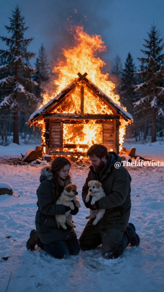 Inside, blind and choking, Maris called for him, her voice cutting through chaos like a rope, and Gavin found her by sound alone, scooping the puppies into his arms, wrapping his body around hers as they lurched toward the doorway. They burst into the snow just before the roof gave way with a roar, sparks and burning timber raining down like the sky itself had caught fire, and Gavin didn’t realize he was bleeding until he felt the heat fading and the cold returning with vicious clarity. The cabin, the place he had built to hide from his own life, became a blazing skeleton and then a collapsing ruin, and they stood in the snow watching it happen, Cinder and Sage whimpering against his chest, Maris’s hand gripping his arm as if anchoring both of them to the present.