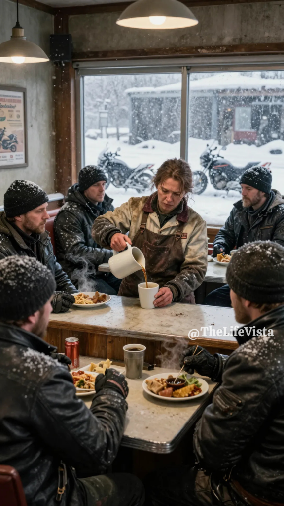 She moved fast, turning every burner on, firing up both coffee machines, hauling stock from the freezer, heating broth, tearing open sugar packets with her teeth while she lined up mugs, and when she returned with blankets from the back she didn’t ask permission before wrapping them around blue-tinged shoulders or pressing a warm cup into trembling hands, issuing clipped instructions that brooked no debate. “Drink this slowly.” “Don’t take your boots off yet.” “Keep your fingers covered.” “If you start shivering less, you tell me immediately.” A younger rider blinked at her like she’d spoken another language, then did exactly what she said, and that obedience—quiet, immediate—made the diner feel less like a hostage situation and more like a triage station that happened to smell like coffee.