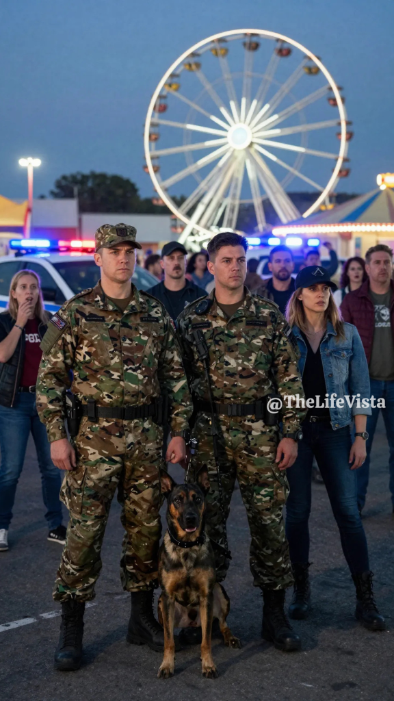 Behind them, sirens began to rise, distant at first, then multiplying until they became unmistakable, and as the first patrol vehicle cut through the fairgrounds traffic, Kestrel shifted his weight forward just enough that the servicemen noticed, just enough that something primitive in their brains finally recognized the truth they had been too careless to see. The first responding officer noticed the dog before he noticed the bl00d, because Kestrel sat perfectly still with his eyes fixed on the men who had put their hands on Rowan, body rigid but controlled, no barking, no growling, no wasted motion, and that kind of stillness is what makes professionals wary.
