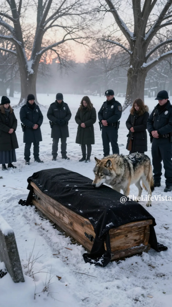 The sound followed, slow and heavy, frozen earth crunching beneath enormous paws, and when people turned, panic spread faster than thought, because there he was, stepping out of the trees like something summoned by shared fear, Aeron, larger and leaner than ever, eyes locked not on the crowd but on the open grave and the simple wooden coffin beside it.