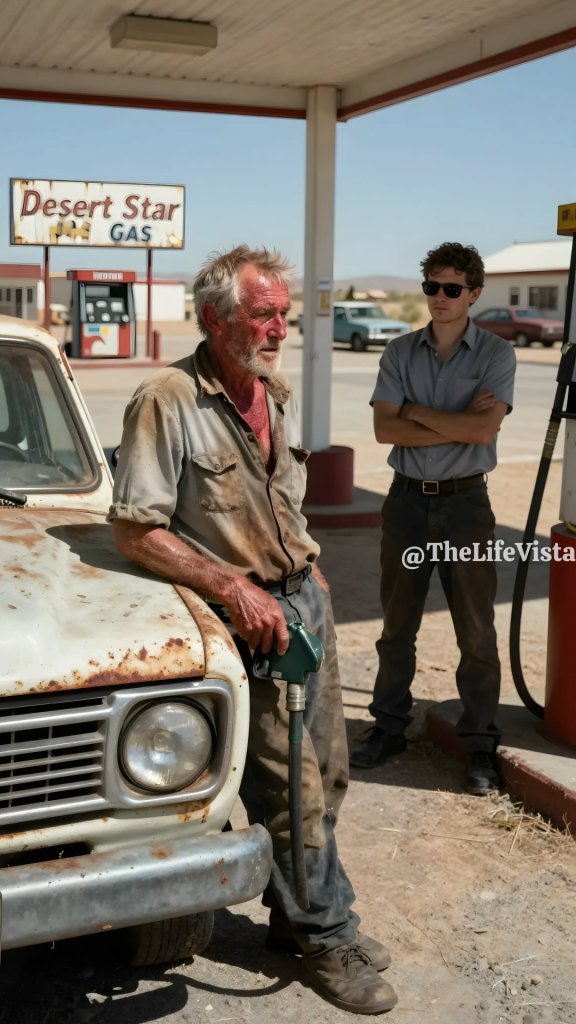 The station itself was forgettable, a weary slab of concrete and rust crouched beneath a merciless sky, the kind of place travelers tolerated only because there was no alternative for miles in any direction, and I had coasted in with my dented pickup coughing and rattling because the fuel needle had sunk past empty long before I reached anything resembling civilization, if a scattering of sunburned buildings could even be called that. I was sixty-nine, my spine stiff, my hands swollen with arthritis, my pension stretched thin enough that every gallon required calculation, and as I watched the numbers crawl upward with cruel slowness, tallying which meals I would have to thin out this week, I did not notice the sports car glide in beside me until its engine screamed for attention like a spoiled child demanding applause.