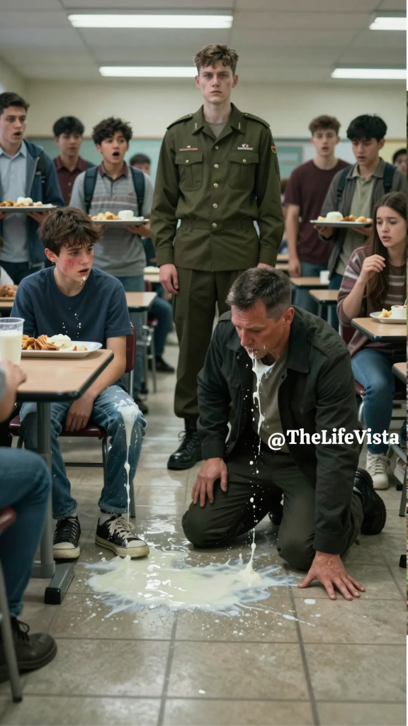 I kept my eyes on my tray because I’d learned that meeting his gaze gave him a foothold, and I moved my hands like everything was normal, like the cafeteria wasn’t a stage and I wasn’t about to be dragged to the center of it. For a second, I thought he might move on, but then his hand snapped forward with that practiced casualness, and he flicked my milk carton like he’d been trained for it. The carton tipped, the seal tore, and cold milk spilled across my tray, flooding the fries and soaking the bread until it sagged.