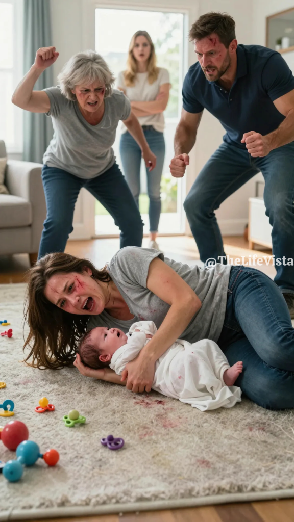 I fell backward, twisting instinctively to protect Noah, my head slamming against the coffee table. Pain exploded through my skull. Noah screamed. Patricia loomed over me, shrieking that I was a liar, that my baby belonged to some random man, that she would expose me to everyone. I tasted blood and felt my face swelling as I clutched my crying son, terrified he’d been hurt.