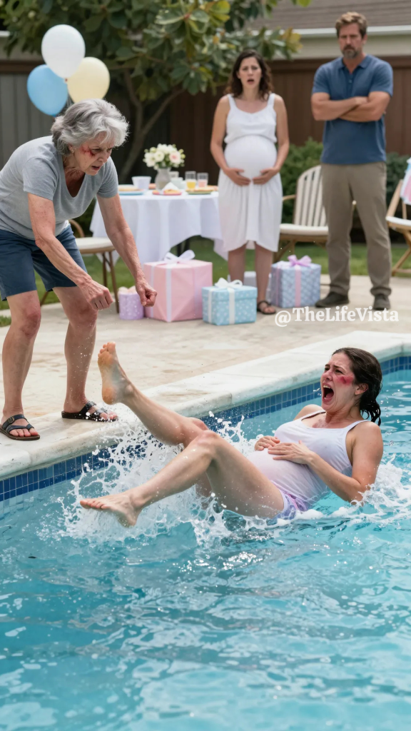 Pain exploded through me, immediate and blinding, like something inside tore, and the air ripped out of my lungs in a sound that wasn’t even a scream because my body couldn’t shape it. Warm fluid rushed down my legs as my water broke on the spot, and it wasn’t the clear fluid you read about in pregnancy books, it was tinged pink in a way that told me something was wrong before my mind could fully process it. Cramping seized me so violently my knees buckled, and I tried to grab onto the nearest chair, onto the edge of a table, onto anything, but the world tilted and my feet slid, and I stumbled backward toward the pool.