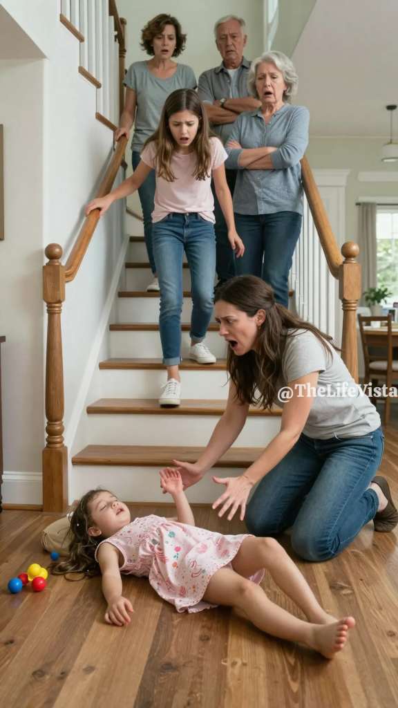 The rest of the family gathered like spectators at a show, and for a split second I expected panic, remorse, urgency, something human. Instead Patrice laughed, an actual laugh, cold and dismissive like the sound of ice clinking in a glass, and she said not to worry, that kids fall all the time, that Wren would get up, and if she didn’t, well, at least there wouldn’t be any more drama. My mother chimed in as if she were correcting my tone, telling me I was overreacting, my father crossed his arms and nodded like this was a debate about manners instead of a child bleeding on hardwood, and above us Tatum stood at the top of the stairs smiling, not scared, not ashamed, satisfied, and that image is branded into me more permanently than any scar. I pulled out my phone and called emergency services with my voice shaking, saying my four-year-old had been pushed down the stairs and wasn’t responding, and my family rolled their eyes and complained about embarrassment and cost, as if an ambulance were a luxury purchase I was making to get attention.
