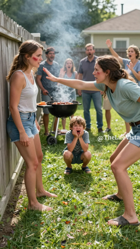 It was a hard, sharp strike, the kind that makes a sound you can’t pretend you didn’t hear. It echoed across the yard, and for a split second, everything went still—the family frozen mid-breath, the kids quieting as if the air itself had shifted.